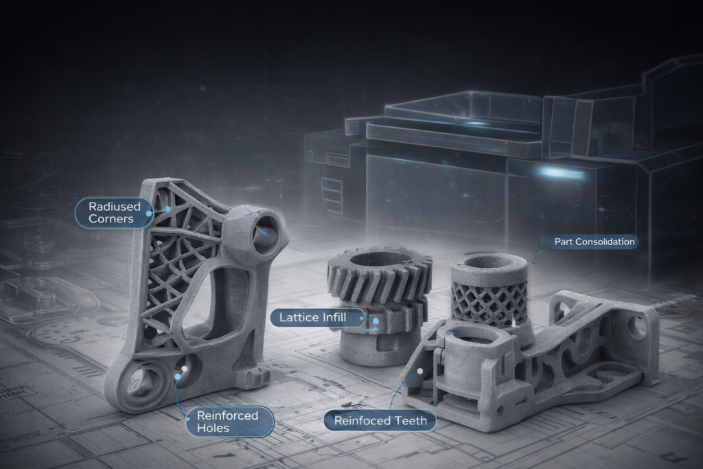 Parts are self-supported by unfused powder during the build, enabling complex internal channels, organic geometries, and interlocking assemblies impossible with support-dependent processes.